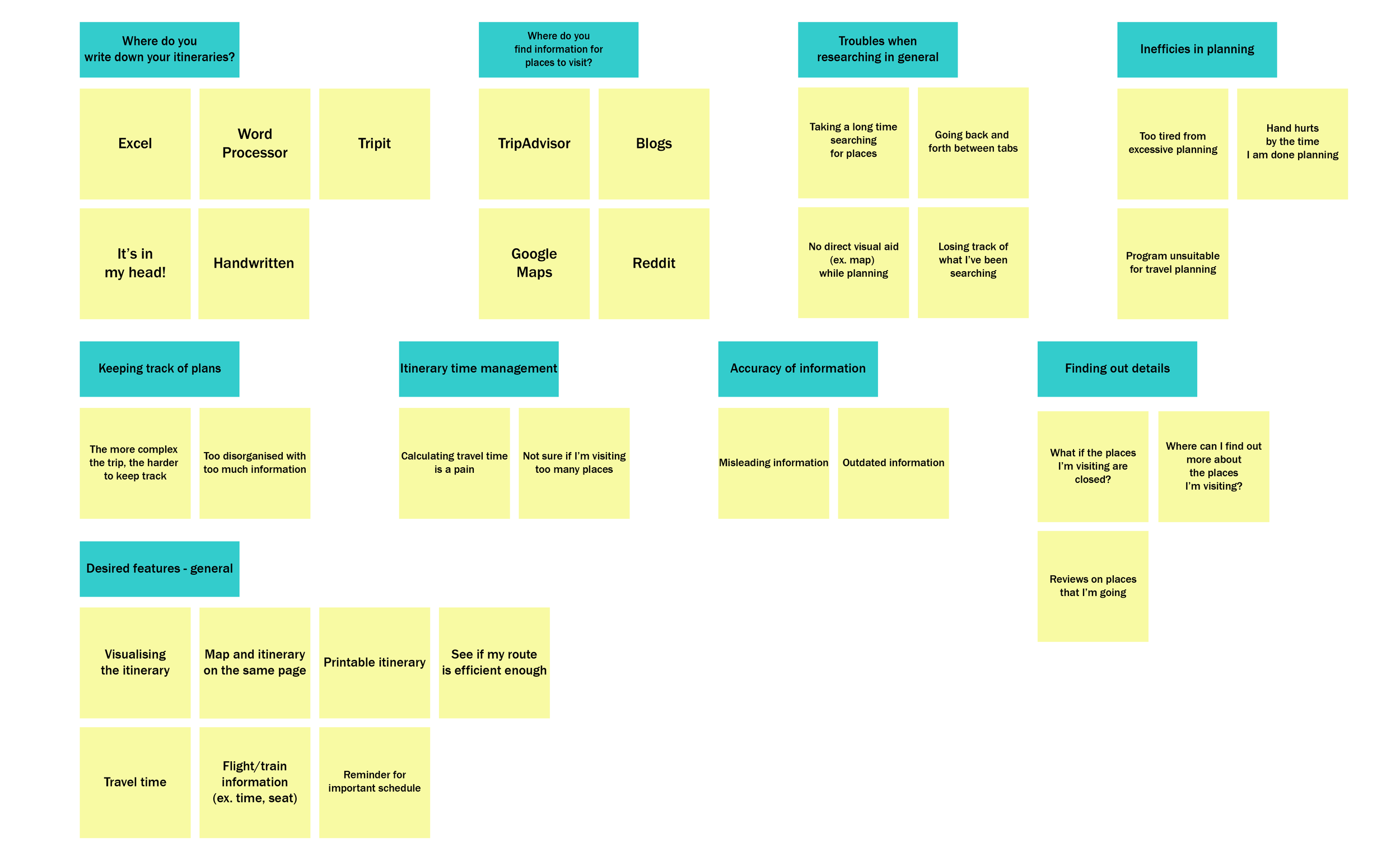 I conducted one-on-one interviews with personal friends between early twenties and late fifties who travel regularly to get a better idea of user behavior in itinerary planning, I have also reached out to members of online travel forums and conducted interviews with five different users: