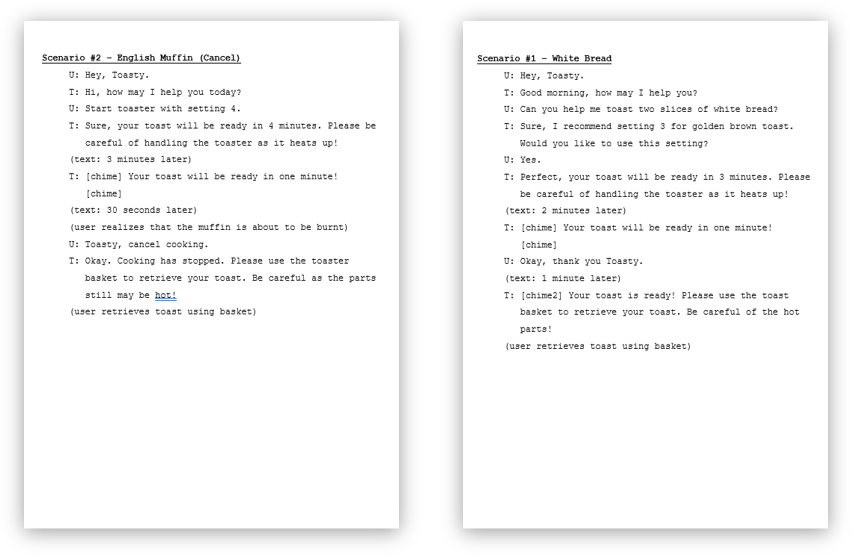 To assist users with making a toast, Toasty’s CUI will give preset recommendations for different types of bread and alert users of cooking time and potential danger.